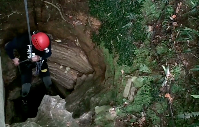 “When you get into the opening, there’s going to be water pouring down on top of you. That’s coming from the waterfall that we’re going to be climbing up. Crawl around the corner, and wait for us there.”