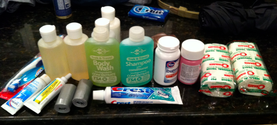 Trek & Travel Bodywash and ShampooThey come in a travel size and they’re biodegradable, super-concentrated, and actually smell pretty good.  Once I run out of this stuff, I can reuse the bottles for whatever is needed.