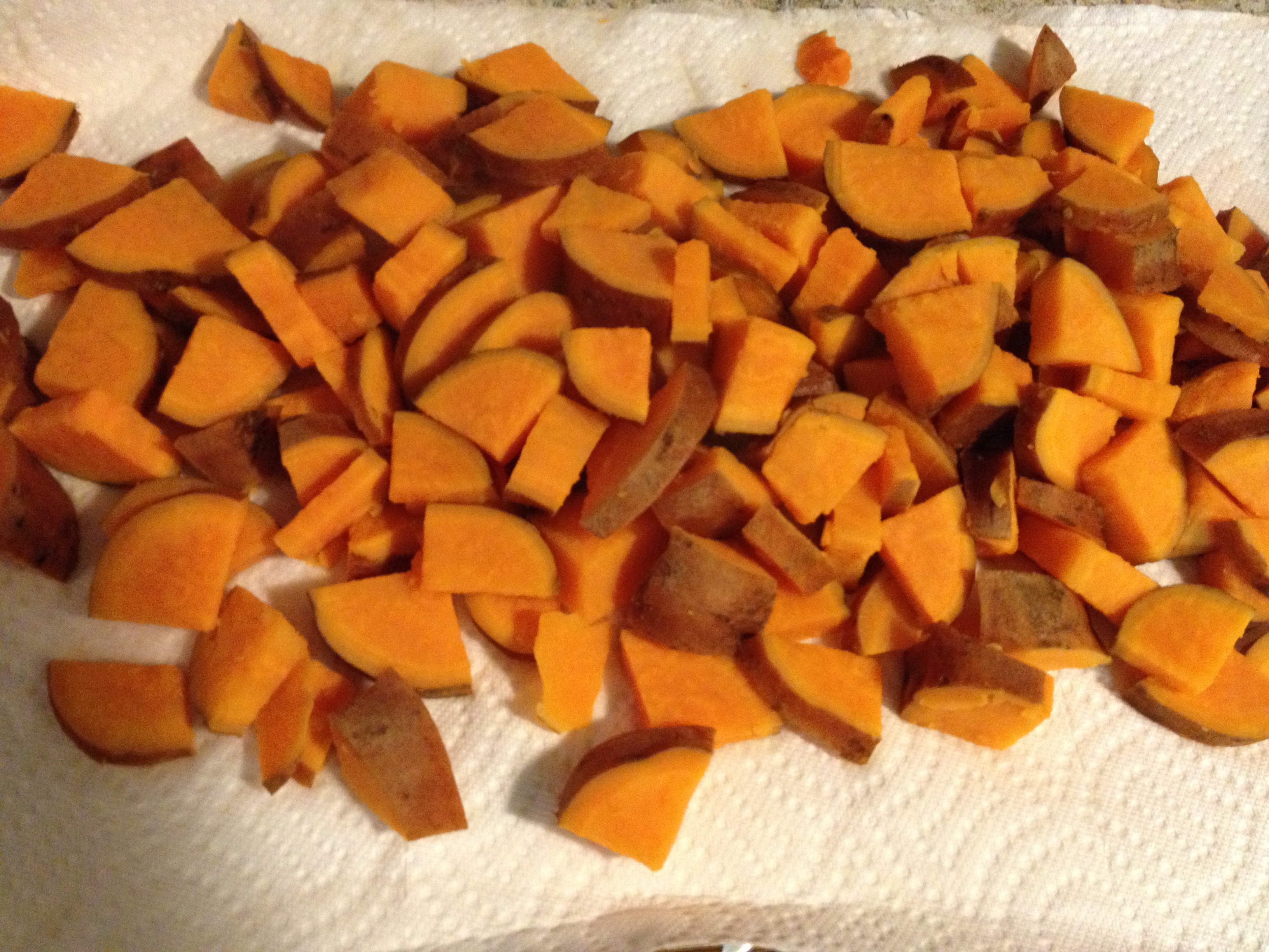 - Start with chopping up your sweet potatoes into small squares. You can peel the sweet potatoes if you would like, but I prefer to keep the skin on.