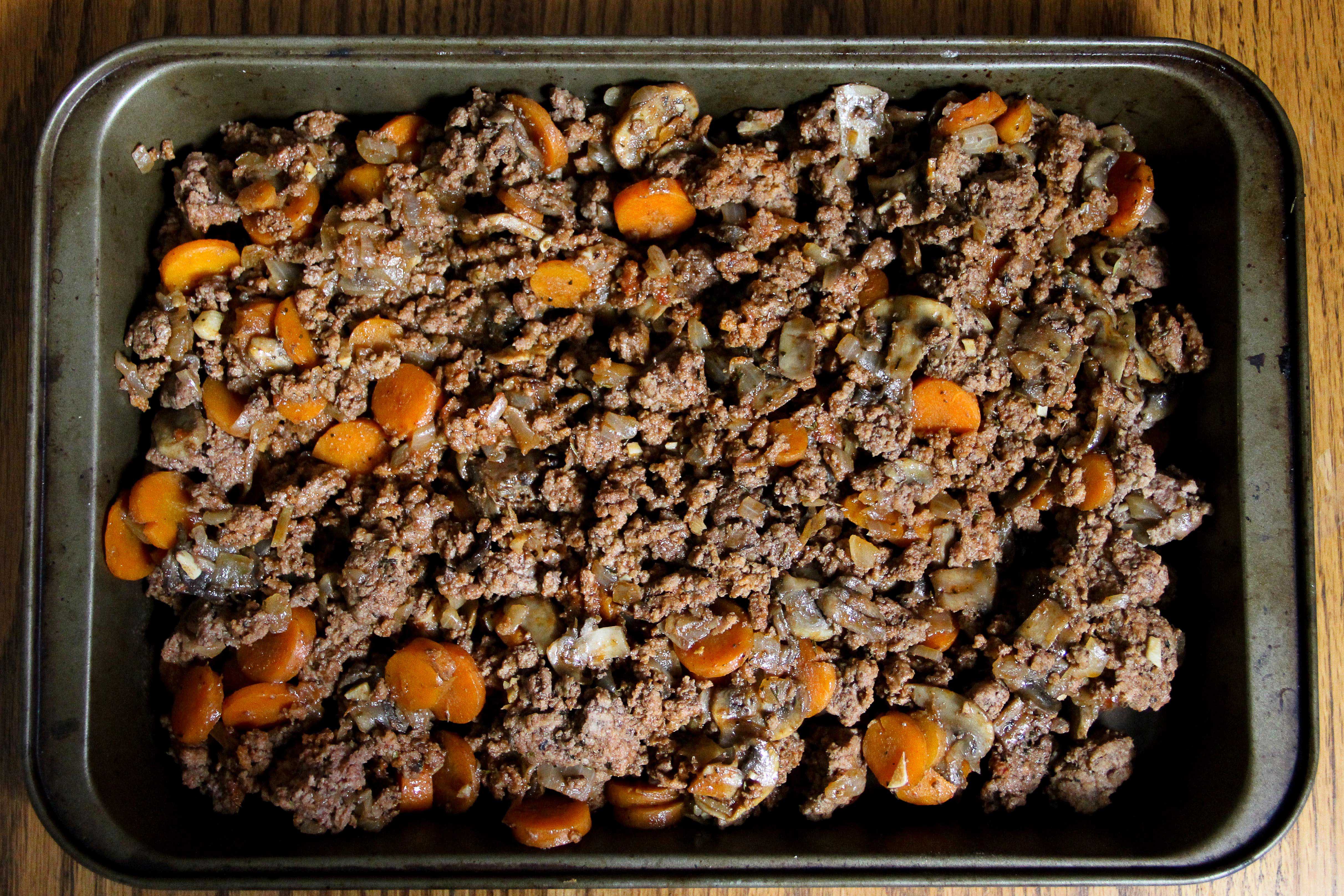- Once you finish one batch of meat and veggies, pour that into your cake pan. Then cook the next batch in the same way. Pour both batches into the pan and flatten the top. It should look something like this: