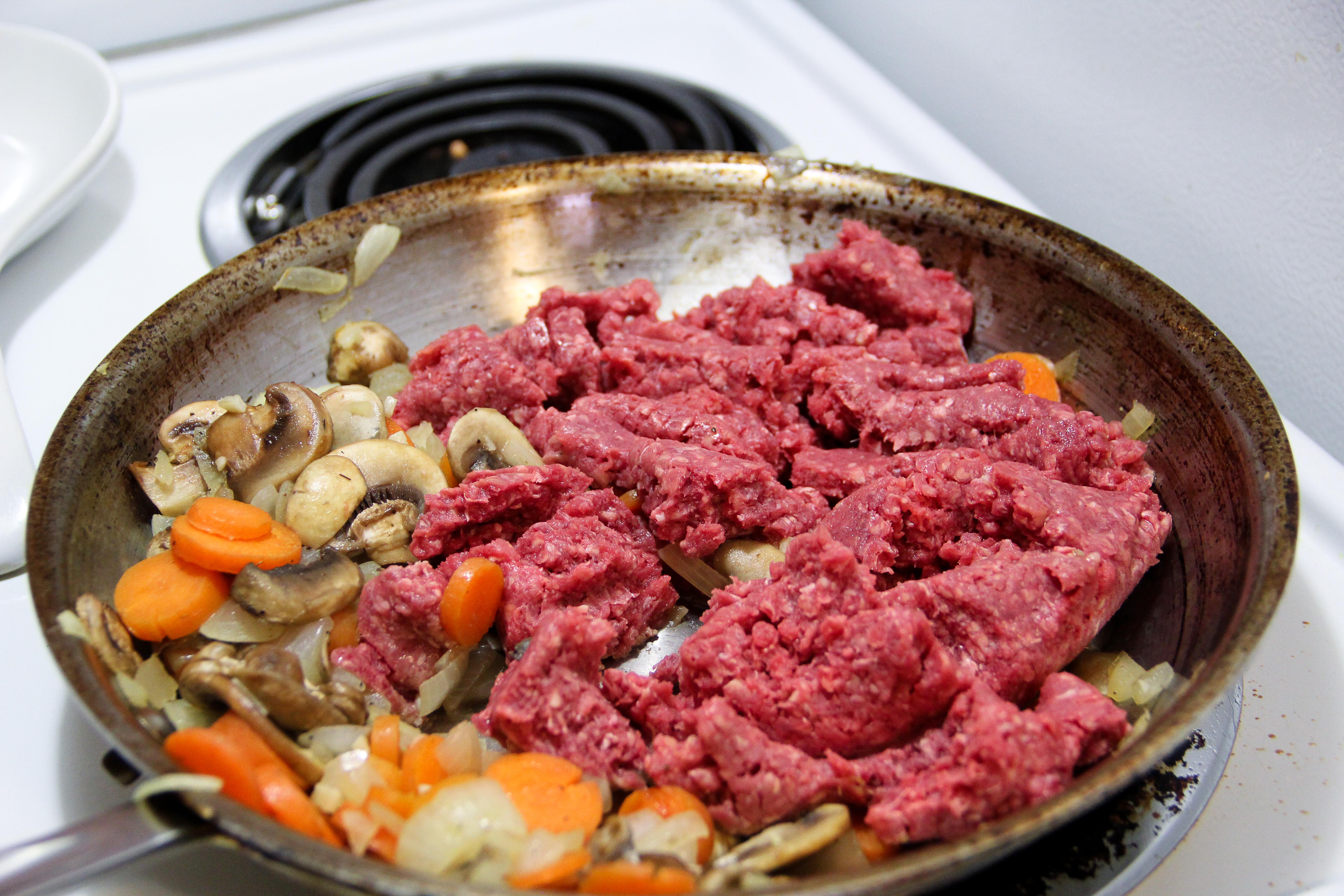 - We’ll cook the other pound of ground beef with the other veggies once the first batch is done. If your pan isn’t big enough, it’s okay to cook this in two separate batches, even if your first batch gets cold while the second is cooking. We’re going to put all our stuff in a pan and bake it after we finish cooking it here, so it’s okay if it cools off a bit. Once you’ve separated half the veggies, add the meat. Break up that lumping lump of meat and mix it in with the veggies like so: