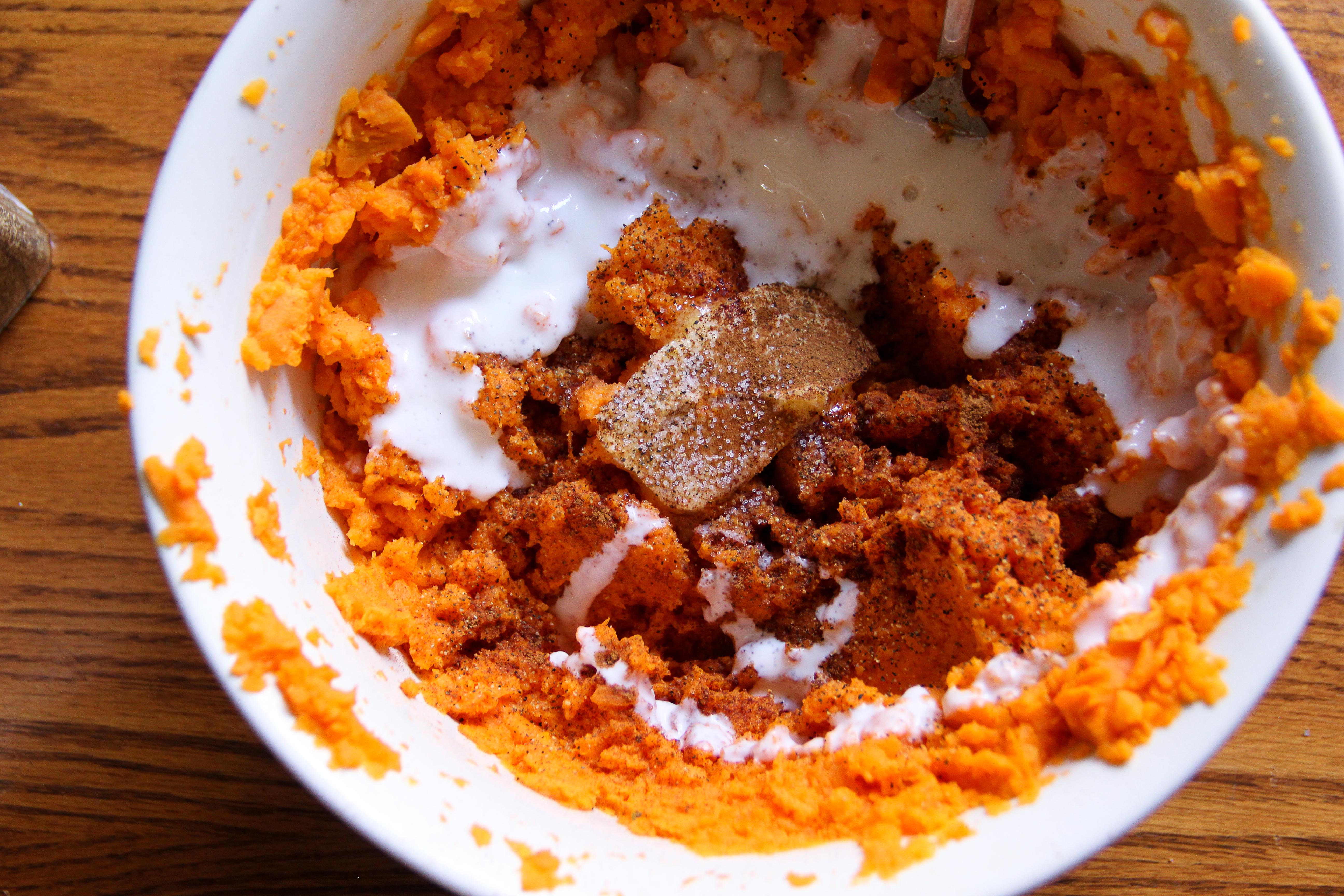 A few shakes of paprika and cinnamon – (also optional) I’m not gonna lie, I put cinnamon in almost everything these days, so it might be a weird suggestion…but no one I’ve fed this to has complained yet. Also, paprika is a new thing that I love on sweet potatoes ever since I started making Staci’s Bacon & Sweet Potato Hash. It’s one of my all time favorite sweet potato recipes. Do yourself a favor and try it!