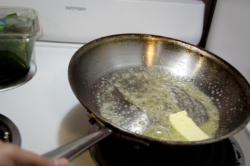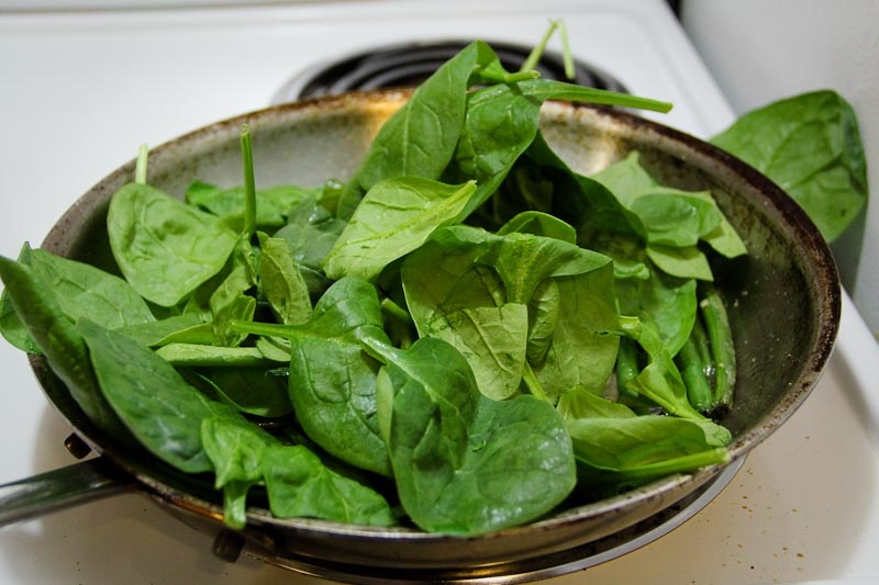 6) After about 5 minutes, toss in your spinach. You might have to do this in batches. Three cups is a lot of spinach and, depending on the size of your pan, the pan may overflow and your spinach might fall out. So if it’s too much,wait until the first cup shrinks down before adding the next cup, and so on…