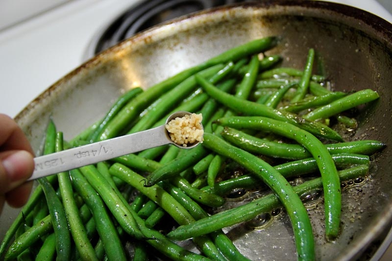 5) Now add your garlic and stir it into the green beans. Be sure most of it sticks to the beans.