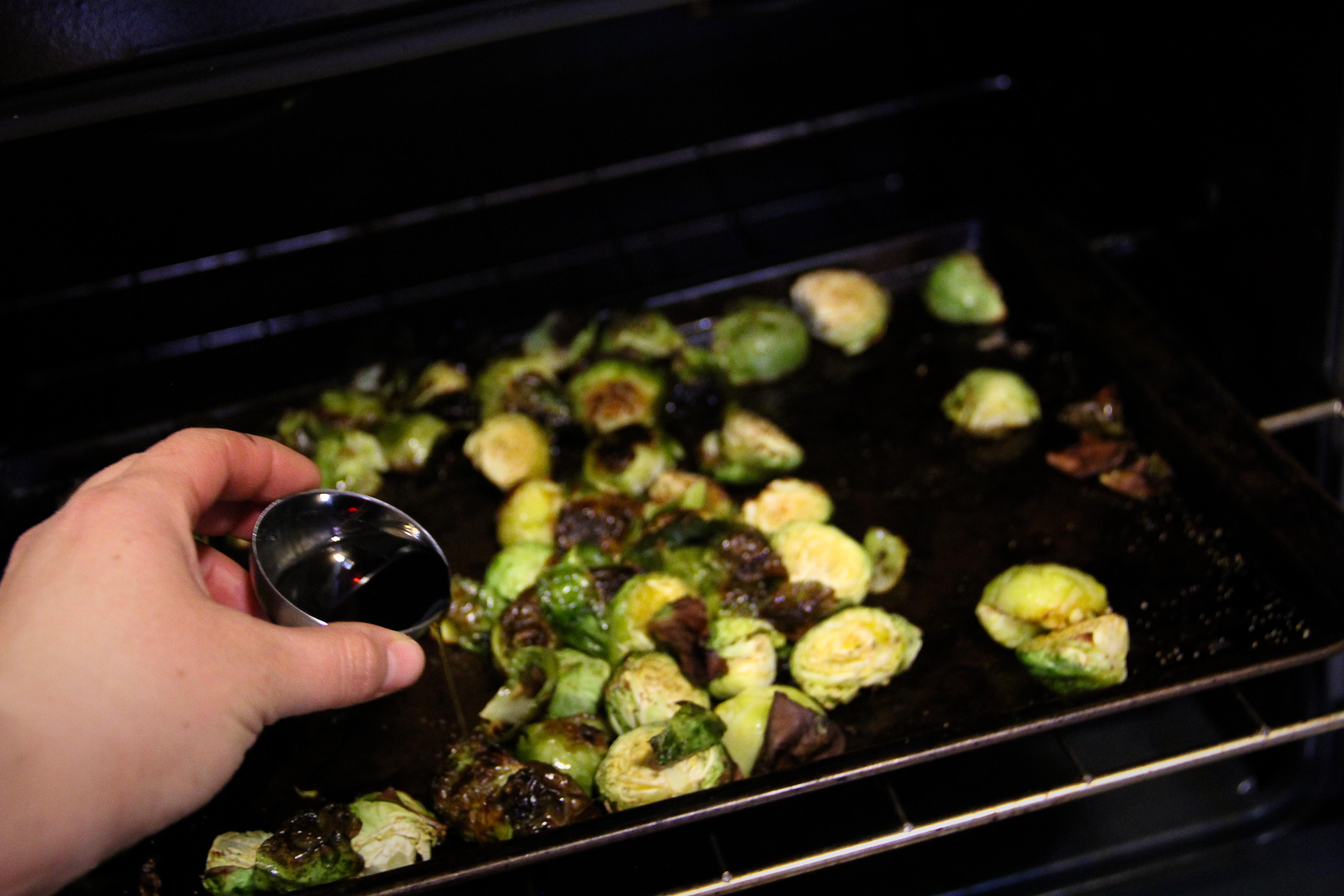 During the last 10 minutes that the brussels sprouts are in the oven, Open up the door and pull them out. Carefully drizzle maple syrup over the sprouts and mix them to coat.