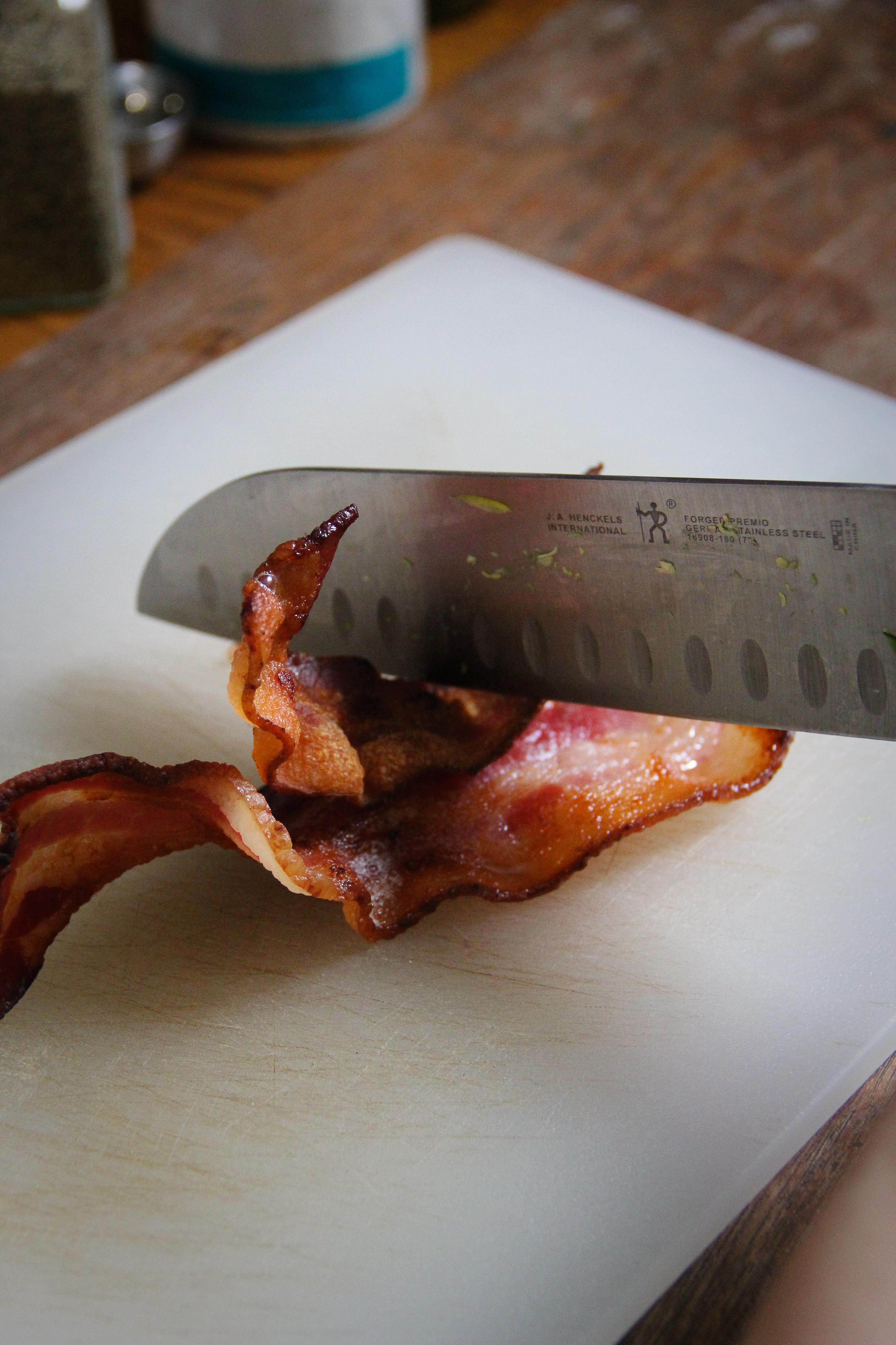 When the bacon has cooled, chop it into little pieces on your cutting board and set aside for later (it may be tempting, but do not snack yet).