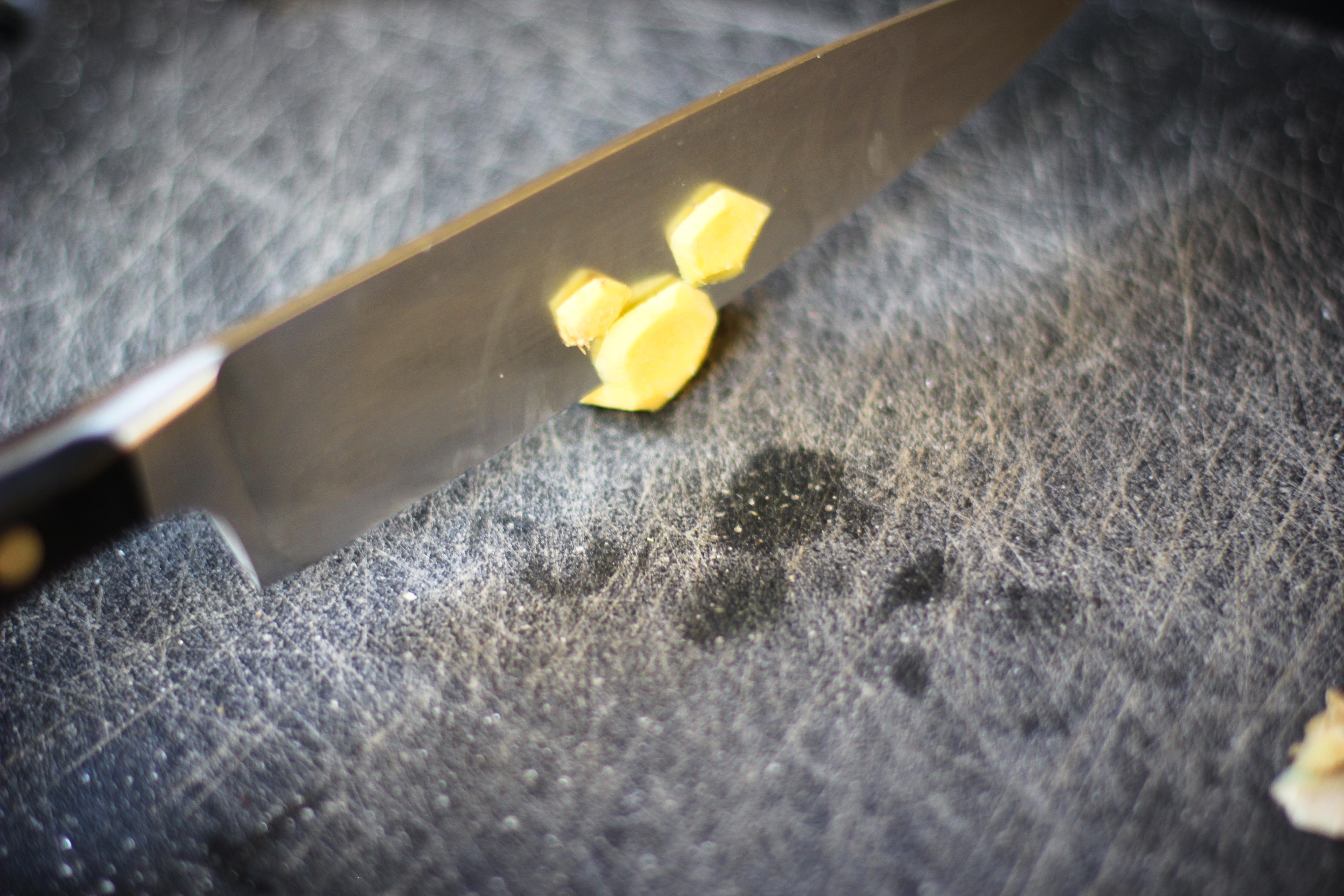 - Next, slice your skinned piece of ginger into medallions.