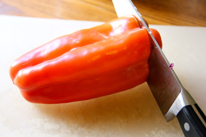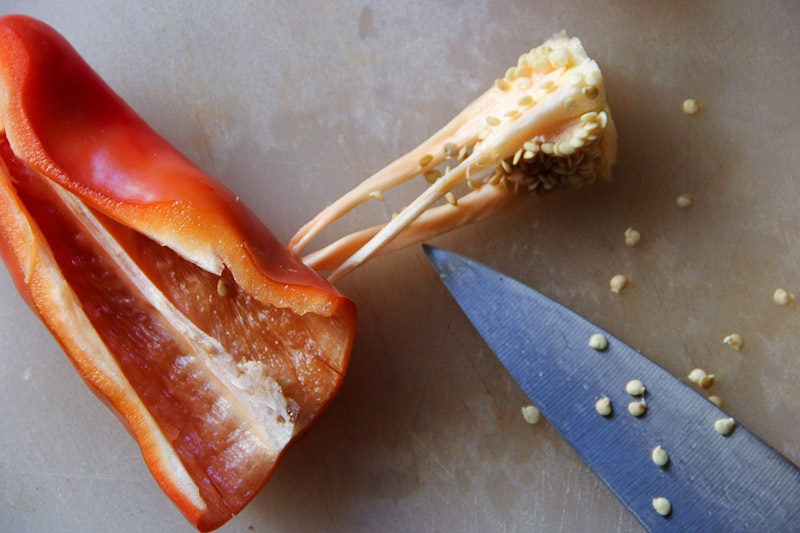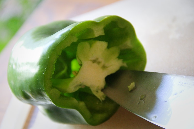 - Carefully move the knife around the perimeter of the pepper, removing the seeds and loosening the white core from inside.