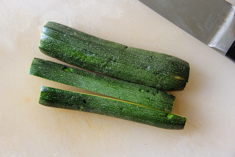 - Cut in half length wise then in half again (kind of like you’re making thick zucchini fries).