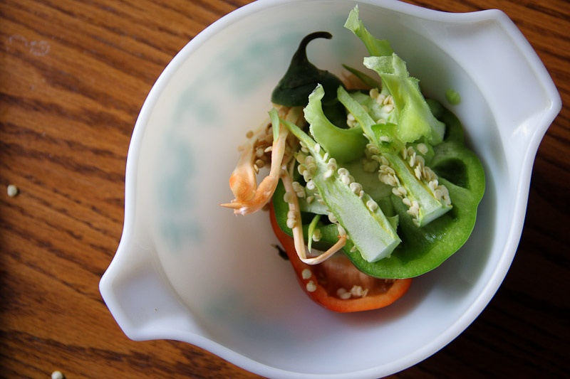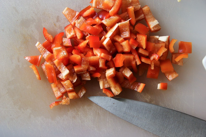 Note* A little tip to help keep your kitchen clean is to clean as you go! Keep your cutting board from getting crowded by putting the extra bits you’re not going to use (like the bell pepper cores and seeds) in a bowl next to your cutting board. This makes it easier to dump in the trash (or compost) later.