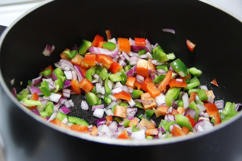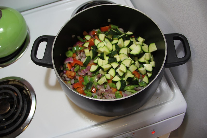 3. Chop all of your veggies. As you’re cutting, you can add the chopped veggies to a bowl to make room for cutting more, this way you can add all the veggies to the pot at the same time. HOWEVAH! Don’t add the zucchini with the peppers and onion. Zucchini takes less time to cook and you don’t want it to be over cooked. We’ll add it in a little later.