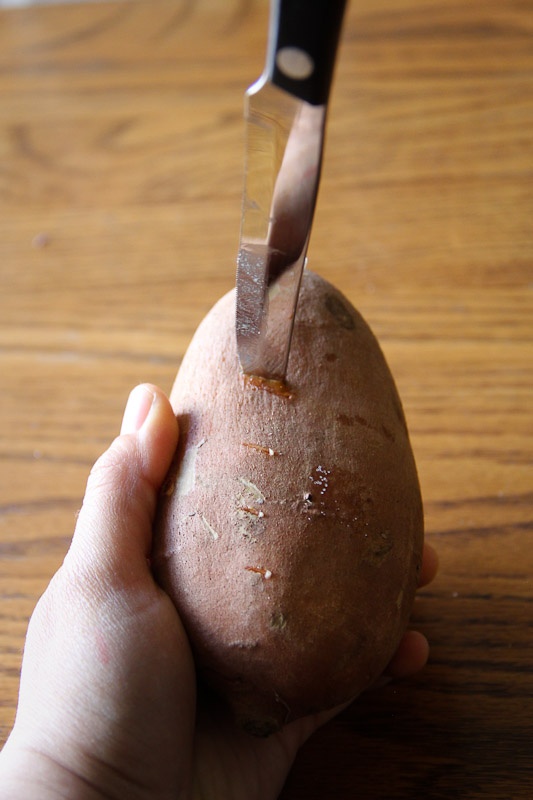 1. Poke a bunch of holes in your sweet potato with a steak knife or fork. Pay attention and be careful not to stab yourself. (I stab myself on accident doing this all the time. It’s not recommended.)