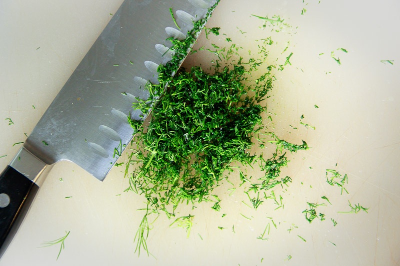 7. Mince the dill the same way you did the cucumber in step 5 and toss it in the bowl with the cucumber.