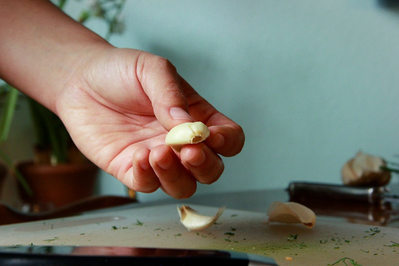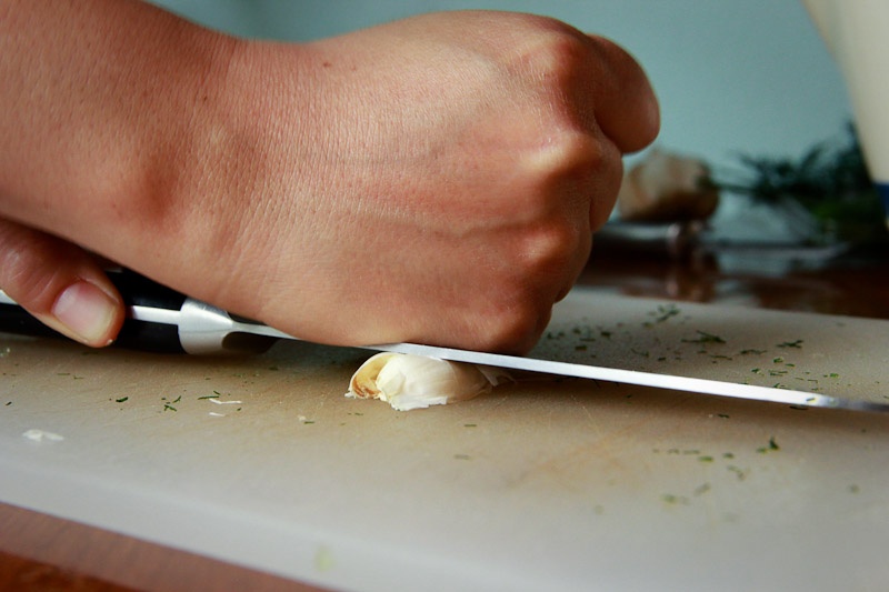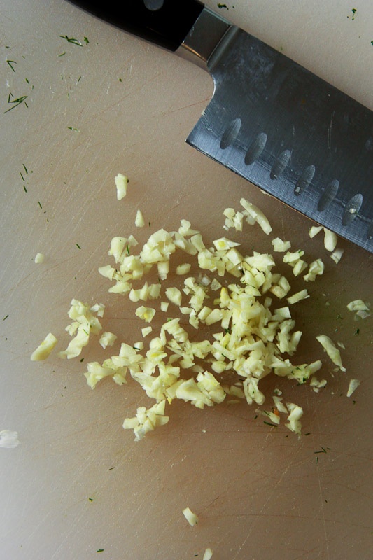 Remove the peel from the clove and cut the garlic into strips. Then mince like you did with the cucumber and dill. Place your garlic cloves in the bowl.