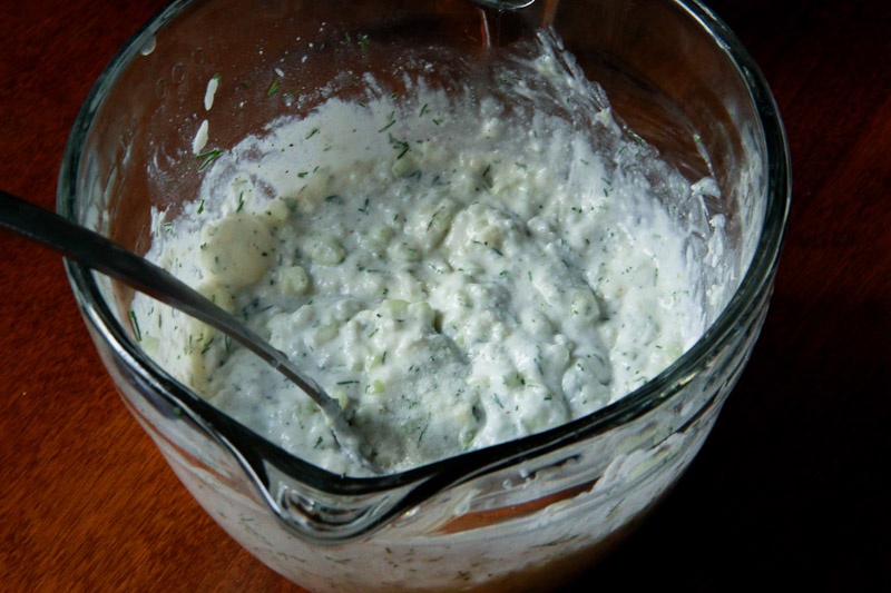 Tzaziki is a yogurt based sauce that is served in most Greek restaurants along with dishes like falafel, souvlaki, and gyros. It contains cucumber, garlic, lemon juice and fresh dill. Its super simple, but it packs a flavor punch and pulls this dish together nicely. Follow these instructions if you feel like adding a homemade sauce to your repertoire: