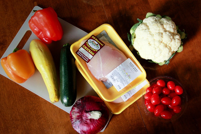 1/2 cup olive oil – My mixing bowls were not big enough to fit all the chicken and the vegetables. If you also have this problem, you can split these ingredients in half for the veggies and the chicken. (So for the olive oil, 1/4 c goes into each mixing bowl.)