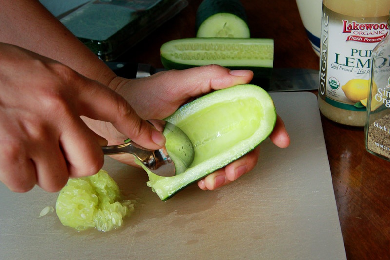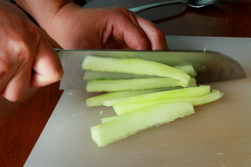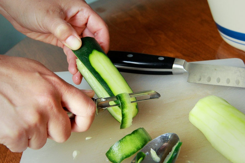 2. Cut the cucumber in half. Peel it with a potato peeler or small knife.
