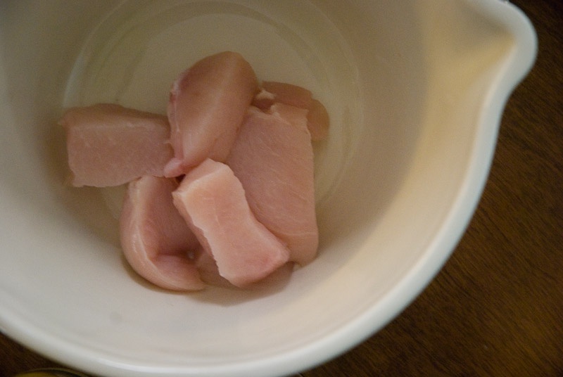 7. Cut your chicken into cube-like chunks. Toss this into a separate bowl.