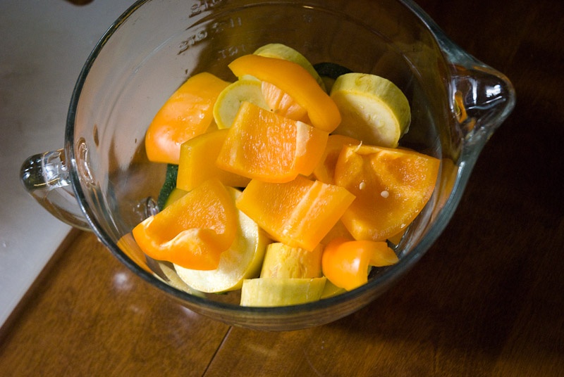 6. Toss your tomatoes into the bowl with all the other veggies. (You may have to use multiple mixing bowls. I can never find a mixing bowl that is big enough for all of the veggies that I want to cook. Life is rough, I know.)