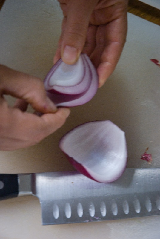 4. Cut the onion in quarters and cut off each end, then peel it. First remove the skin, then separate each layer.