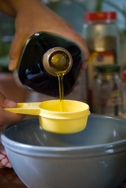 8. Once all your veggies and chicken are cut up and in your bowl, it’s time to mix up the sauce. Start with 1/2 cup olive oil.