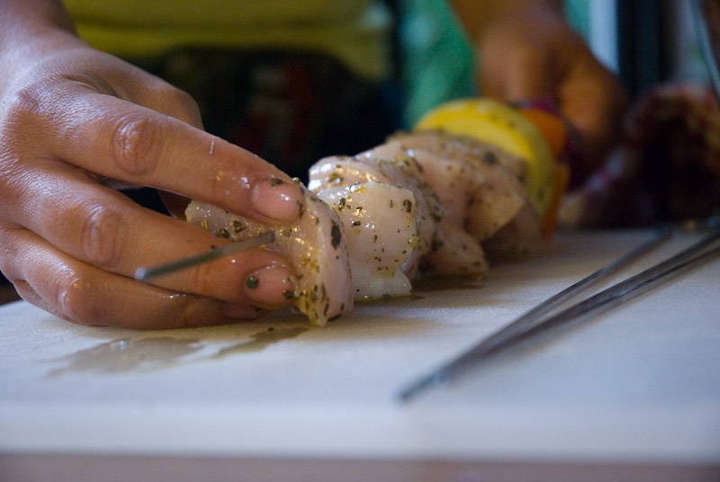 Alright, we’re all set to put these suckers together! All we have to do is wash and cut our veggies and chicken, add some spices, and assemble it all on skewers!