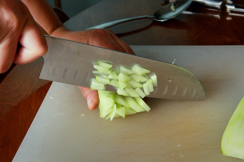 5. Now we’re gonna chop that cucumber super small. Hold the knife parallel to your body. Place your hand lightly on the top front end of the knife to keep the tip of the knife on the cutting board and use the heel of the knife, the part close to your hands, to chop the cucumber. Use a rocking motion and move the heel of the knife back and forth over the cucumber until it is minced. Take all that cucumber and put it in your small mixing bowl.