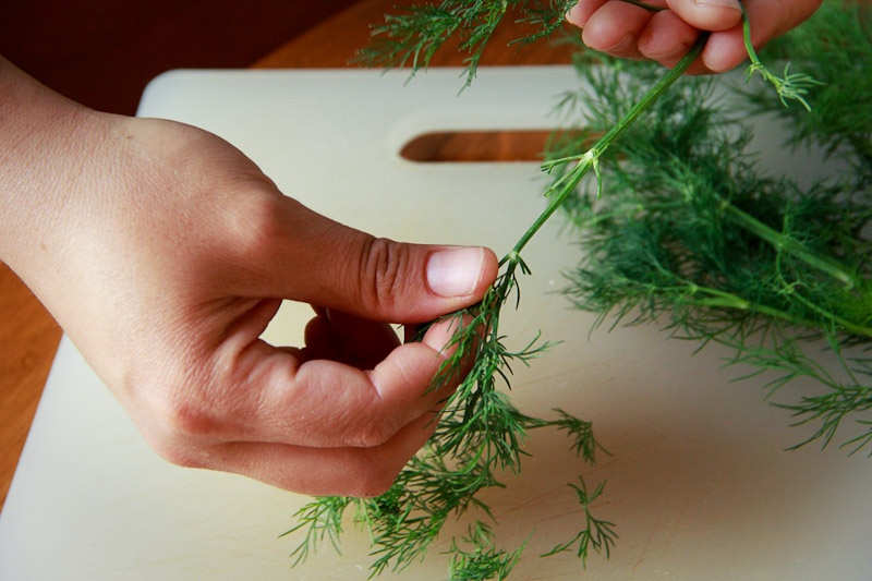 6. Take your fresh dill. Remove the “leaves” from the stems of the plants. Remove enough leaves so that you can measure 2 tbsp of leaves in a spoon before chopping.
