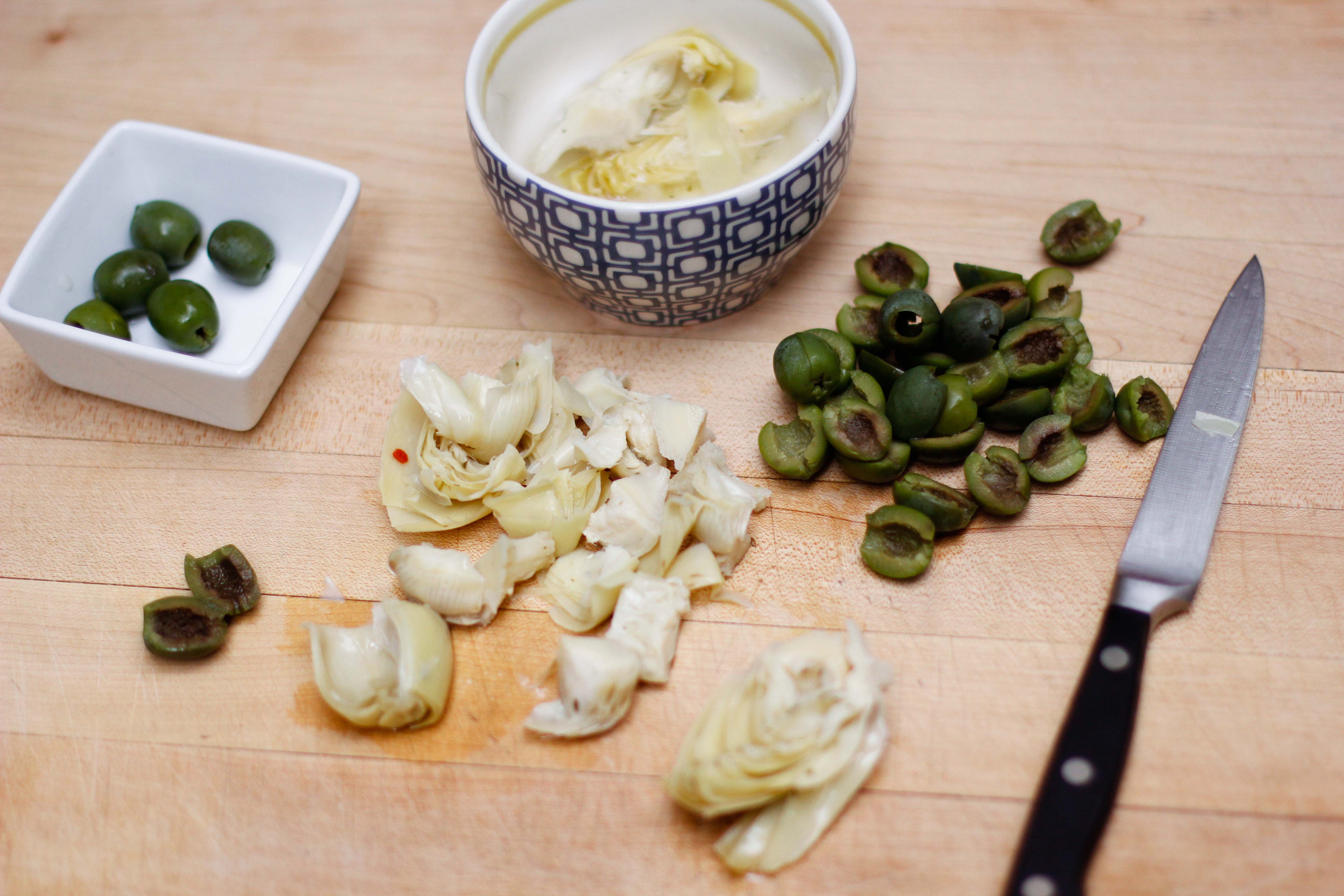 3. Cut your olives in half and slice and separate your artichoke hearts. Measure out your sun dried tomatoes.