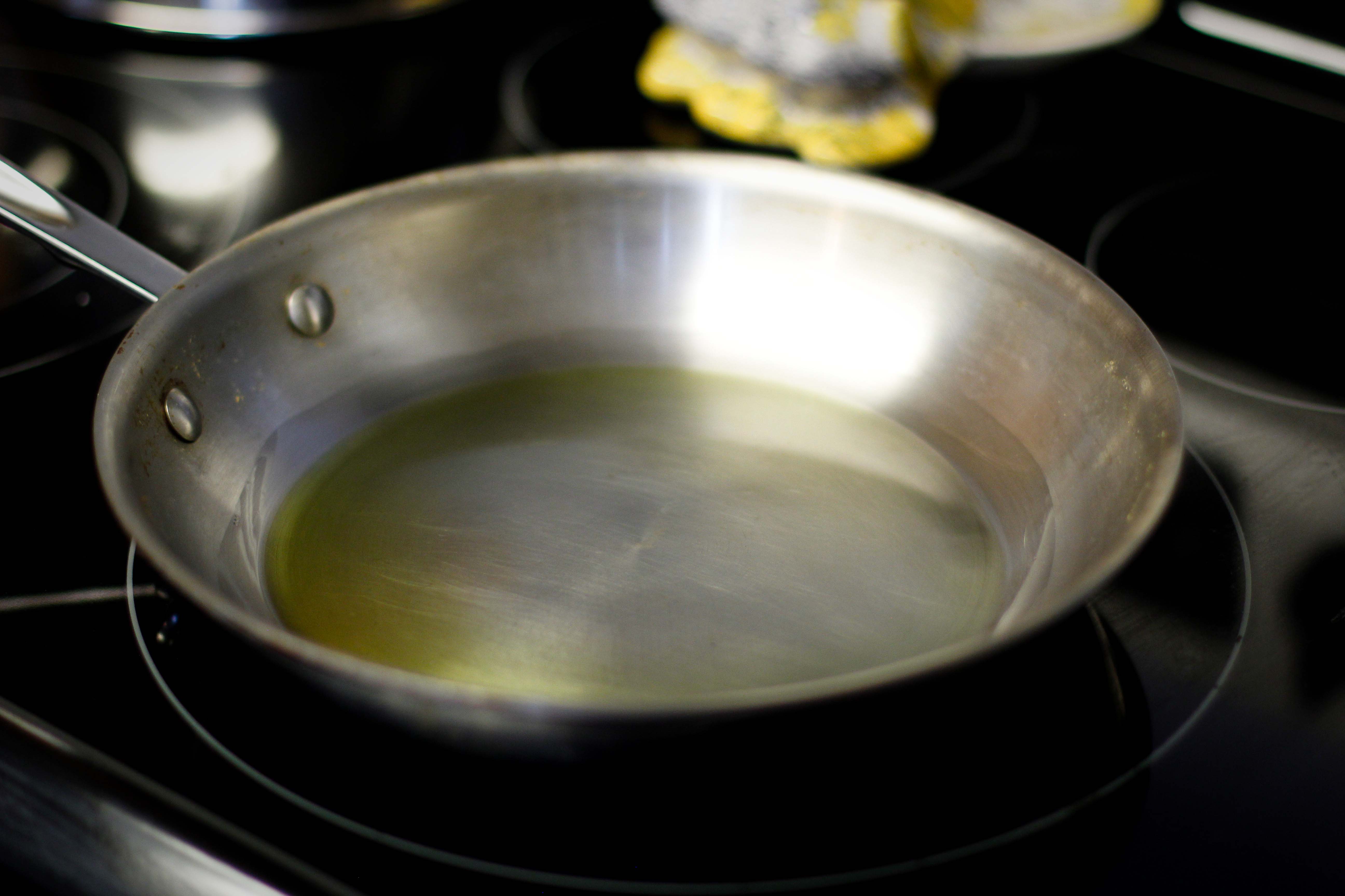 6. Heat up your pan with 1 Tbsp (15mL) olive oil in it. When the oil is shiny and moves around quickly as you tilt the pan, you know it’s ready.