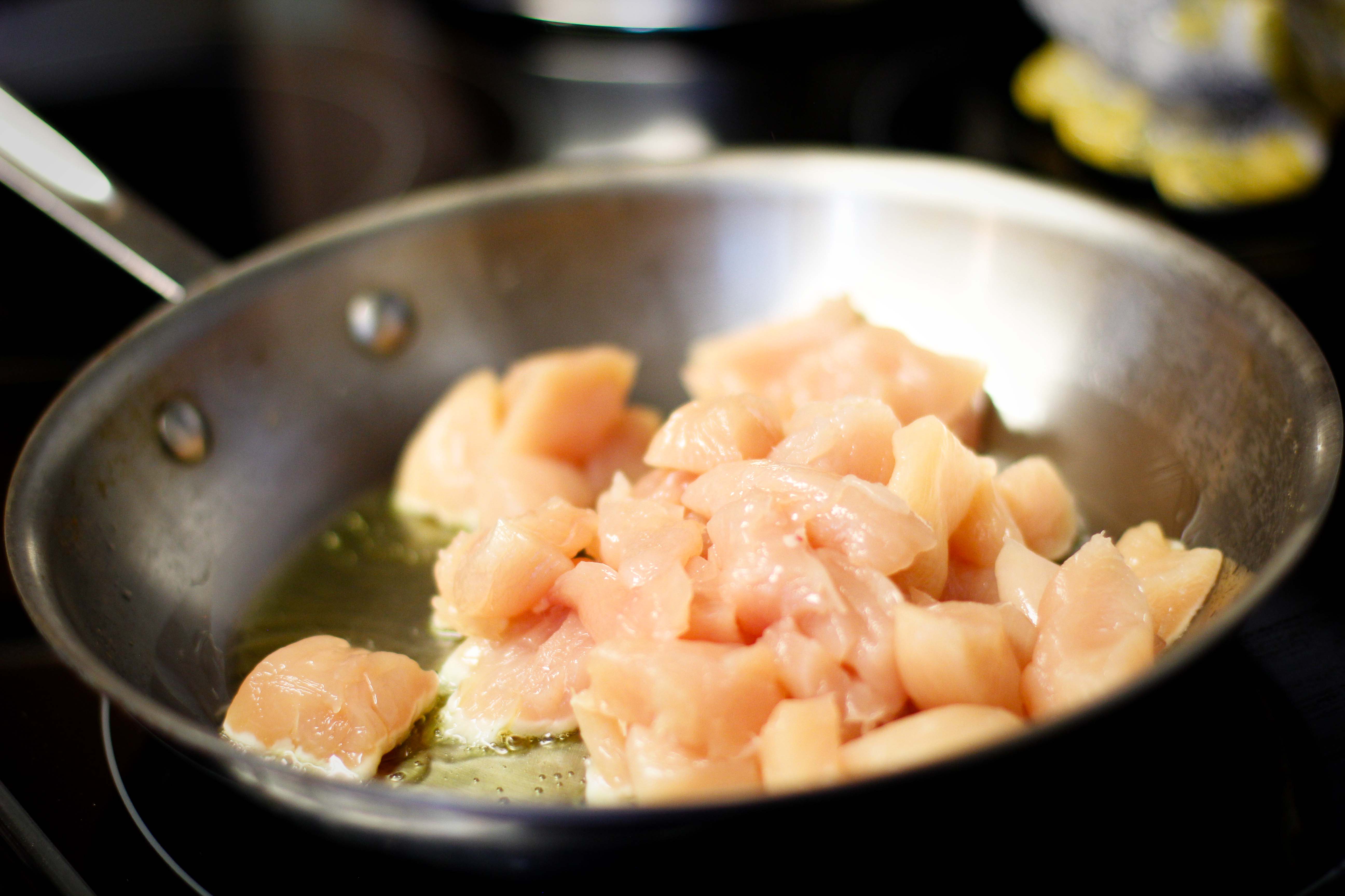 7. Once the oil and pan are hot, toss the chicken in and cook through, stirring occasionally. This will take about 15 minutes.