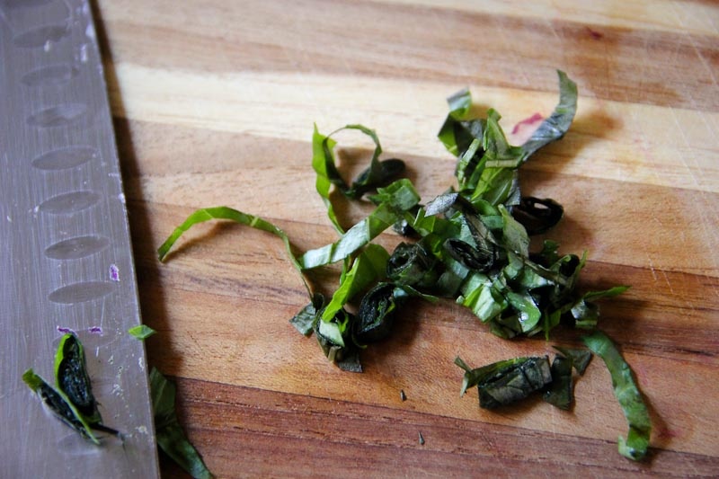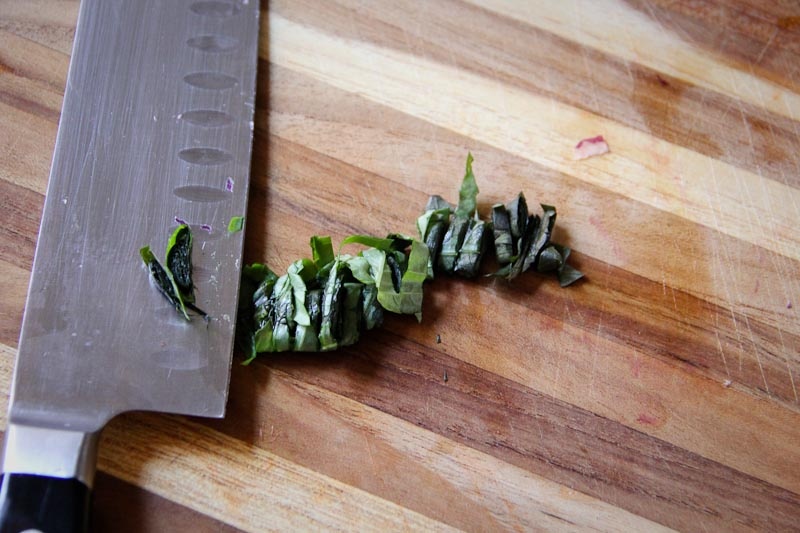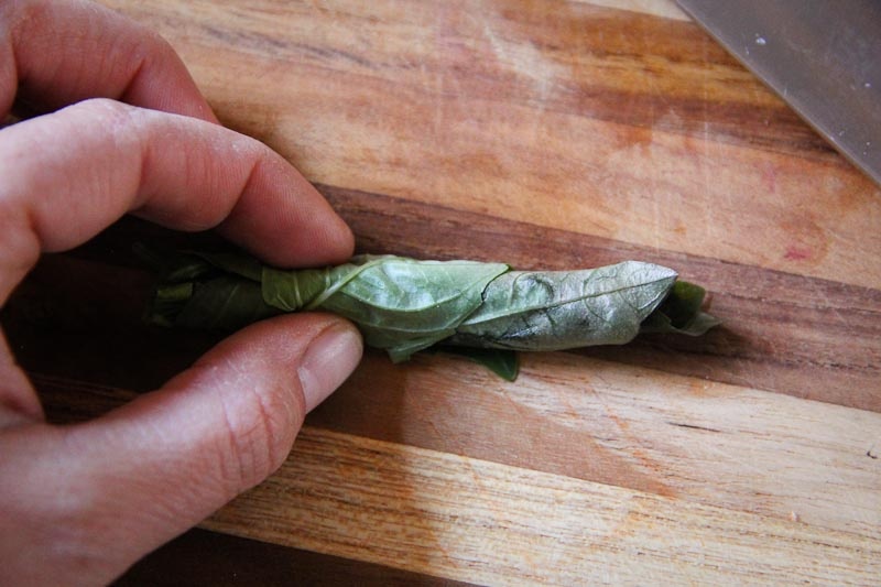 If using basil, now is the time to “chiffonade” it: