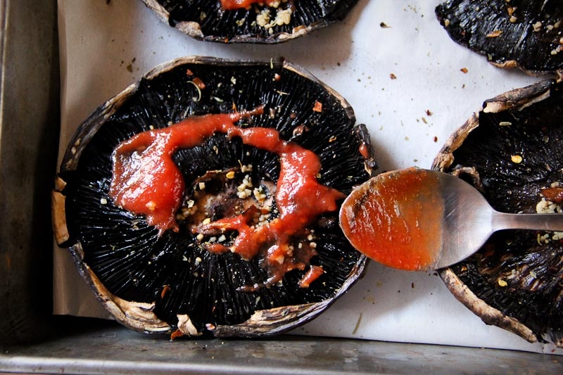 - Now you can place your toppings on the pizza any way you like, but I usually start with the sauce. Spoon your sauce onto the mushrooms and spread it around.