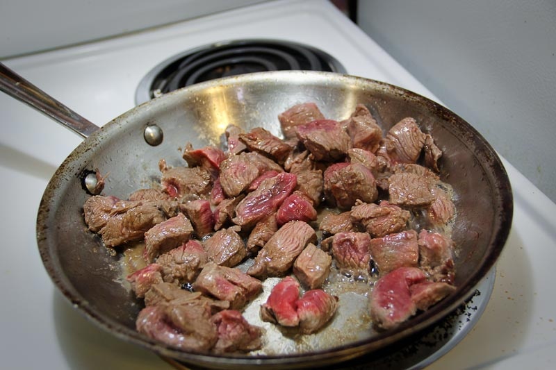 6. When the oil is hot, place your beef in the pan and let it sear (brown) on each side for 3-4 minutes. We don’t want it to cook all the way through. We just want it to brown on the outside. Why do we do this? That browning on the meat is something called a Maillard reaction. It adds depth of flavor and deliciousness to your dish.