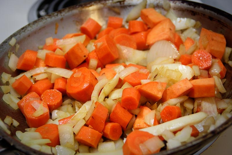 - Next, we’ll sear the carrots and onions. Let the pan heat up again with some oil in it. Add the carrots and onions to the pan and let them brown for a couple of minutes.