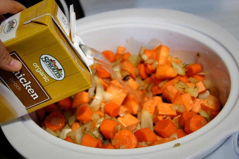- Take your pan off the heat. Pour 1/2 cup of your broth/stock into the warm pan and use a spatula or whisk to mix it around. Once you feel like you’ve gotten the bulk of the stuff suspended in the liquid, pour that liquid into the slow cooker along with everything else.
