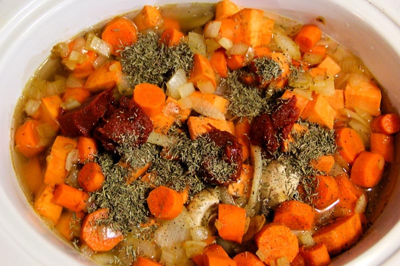 - Add the mushrooms and sweet potatoes to the crock pot.