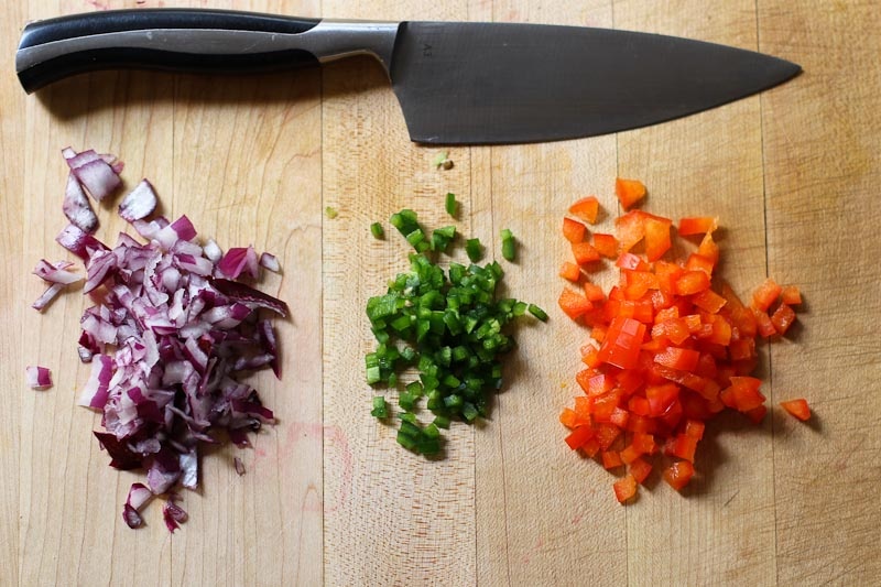 1. Dice your bell pepper, jalapeno, and 1/4 of your onion. Here is a picture of what mine looked like, so you can see about what size they should be. If they’re not exactly that small or you want to cut them a different size, that’s fine. Totally up to you!