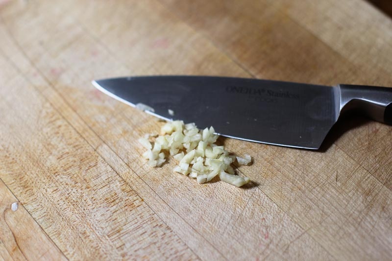 2. Smash and mince (cut really small) your clove of garlic. Add that to your mixing bowl as well.