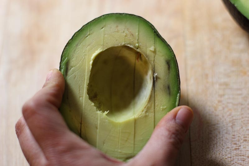 Then, make slices vertically down one of the halves. (I chose the half without the seed so I wouldn’t have to take out the seed right then.)