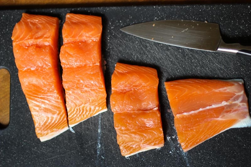 6. Cut your fish into single serving sized portions. My 1 lb salmon filet sliced pretty nicely into 4 pieces. It might be tough to get your knife through the scales if your knife is not especially sharp. It was tough for me. Just keep at it and don’t cut yourself.