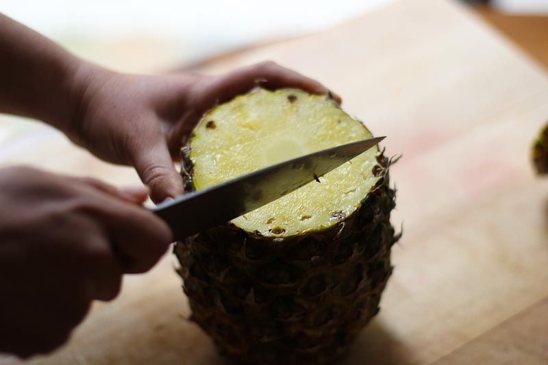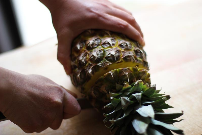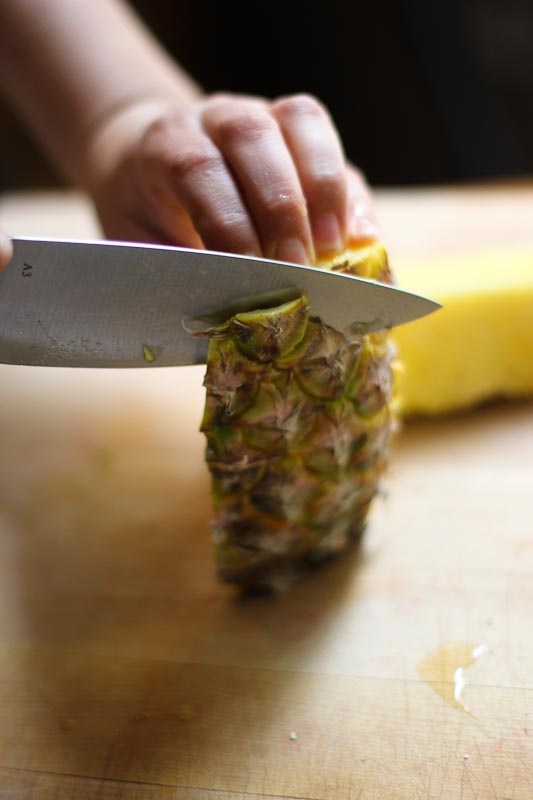 4. Now it’s time to cut the pineapple! I so rarely buy pineapples at the store, but luckily the day I went shopping, not only were pineapples on sale, but they were also ripe! Score!
