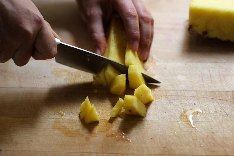If you have some indentations with the skin still in them (eyes) in your pineapple, that’s okay. This is edible, but not a nice texture to chew. You can carefully cut these pieces out with a smaller knife or chop them off after the next step.