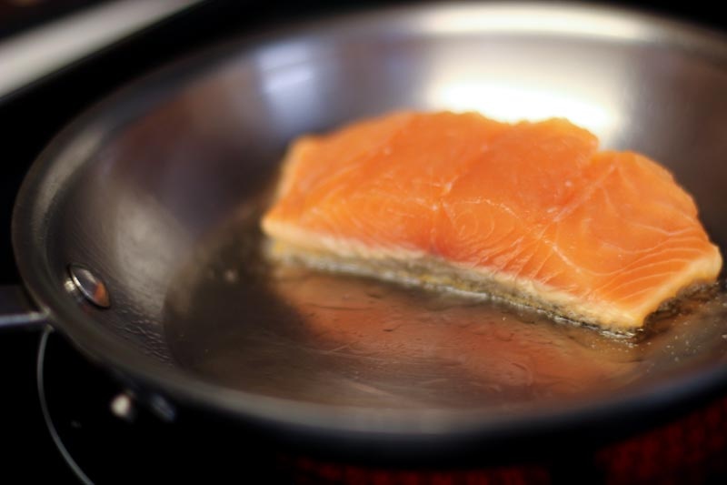 8. When the pan is hot enough, carefully place the fish skin-side down in the pan. Do not drop or throw the fish! This will cause oil to splash up and burn you, and that is no bueno.