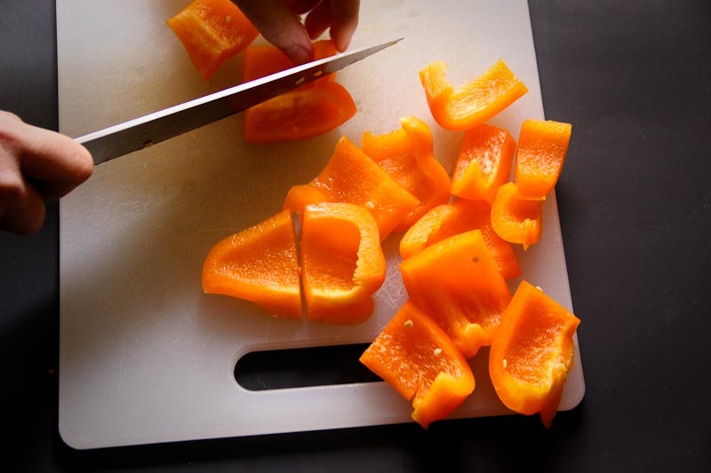 From here, you’ll have two relatively flat pepper halves to cut into bite sized chunks.