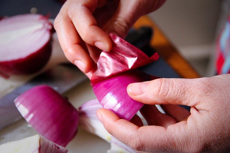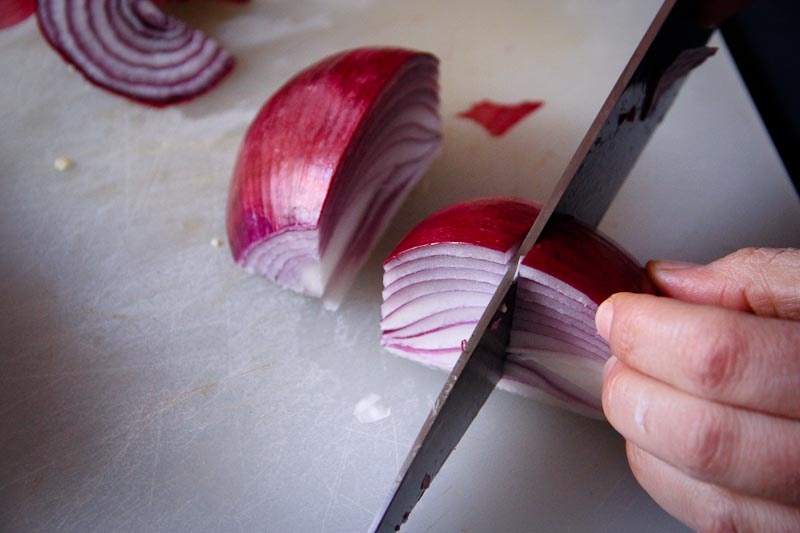 Then cut the onion in half so that you have a flat surface to work with.