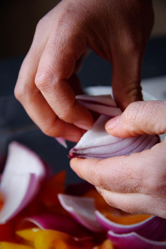 For roasting, we want relatively larger chunks of onion. If we dice the onion like we did for paleo spaghetti, the pieces of onion will be too small and they’ll burn before the larger pieces of vegetables are cooked. This is no bueno.