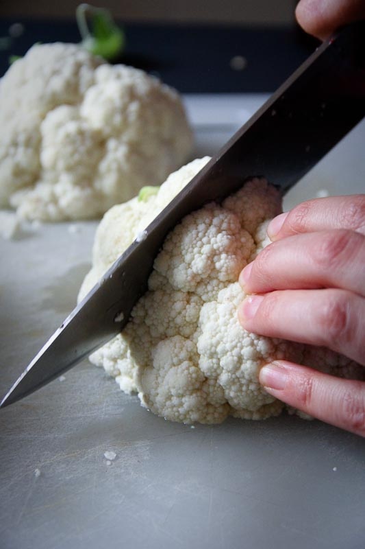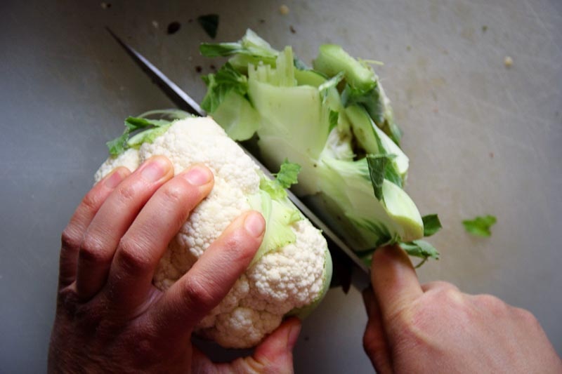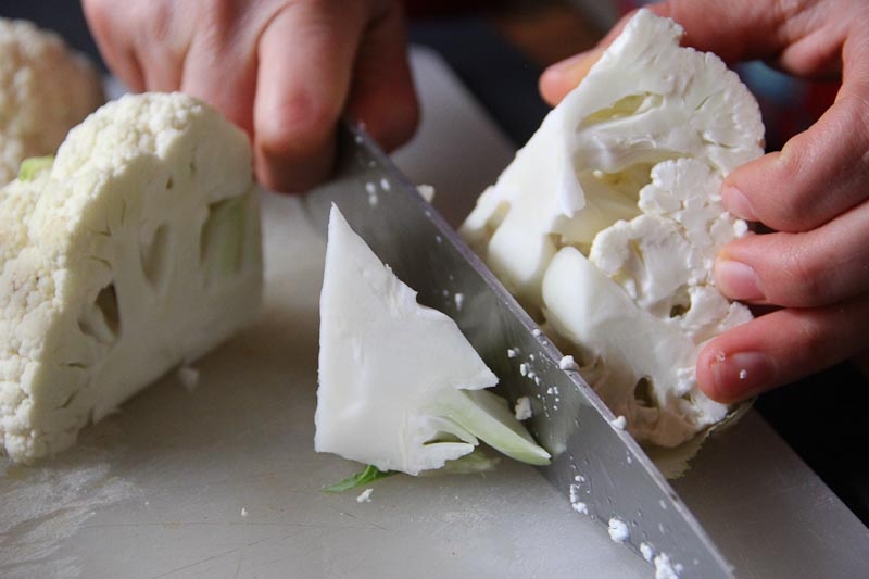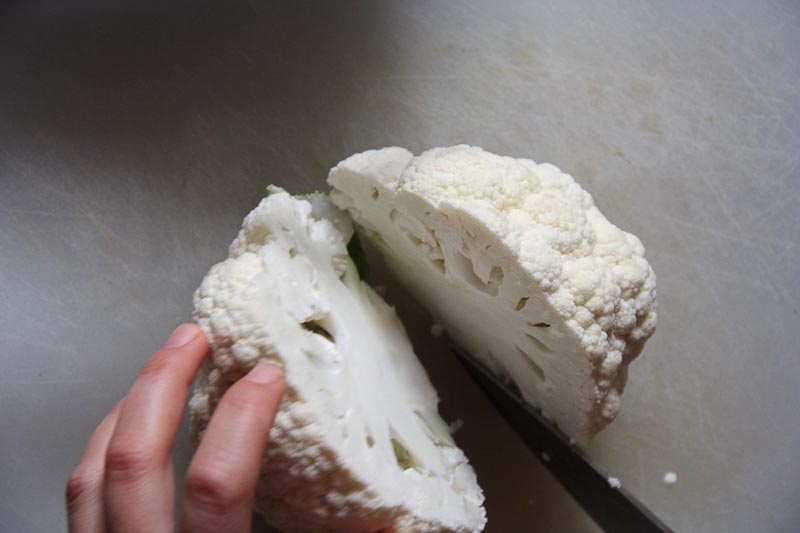 Most cauliflower comes with the leaves and part of the stem still attached. Go ahead and remove that. Just pull it off with your hands.