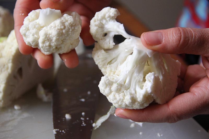 Now use your hands to tear apart the large chunk of cauliflower into smaller florets.