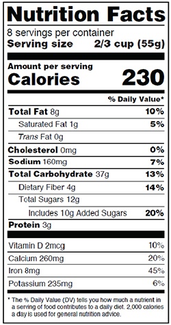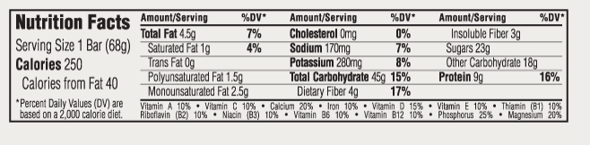 Serving Size. This is somewhat self-explanatory: serving size is the amount of food, by volume or weight, that is considered one “serving.” New FDA regulations require this size should be typically what someone would eat in a single serving. Which matches what we see here, with “1 Bar.”